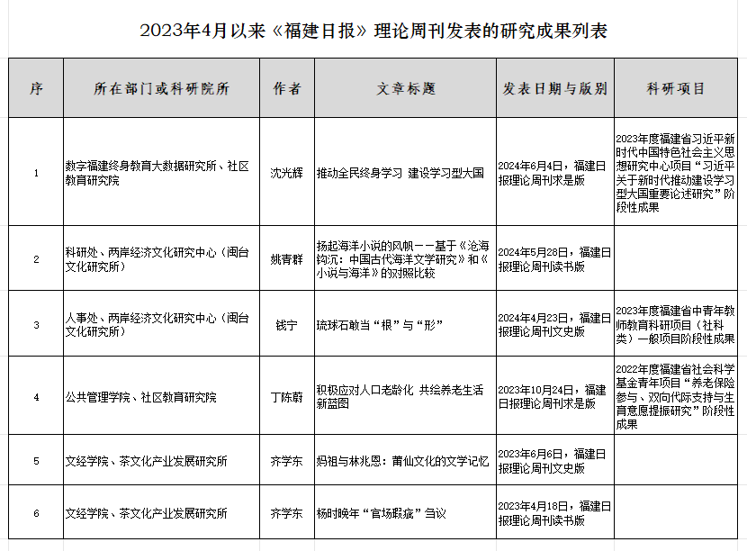 开展“三争”行动以来,结合有重点、有组织的科研工作要求,在科研项目带动与科研院所工作的深度影响下,我校自2023年4月起先后有6篇理论研究成果在《福建日报》理论周刊刊发,有效增强了学校的社会影响,扩大了我校特色科研成果的产出渠道。