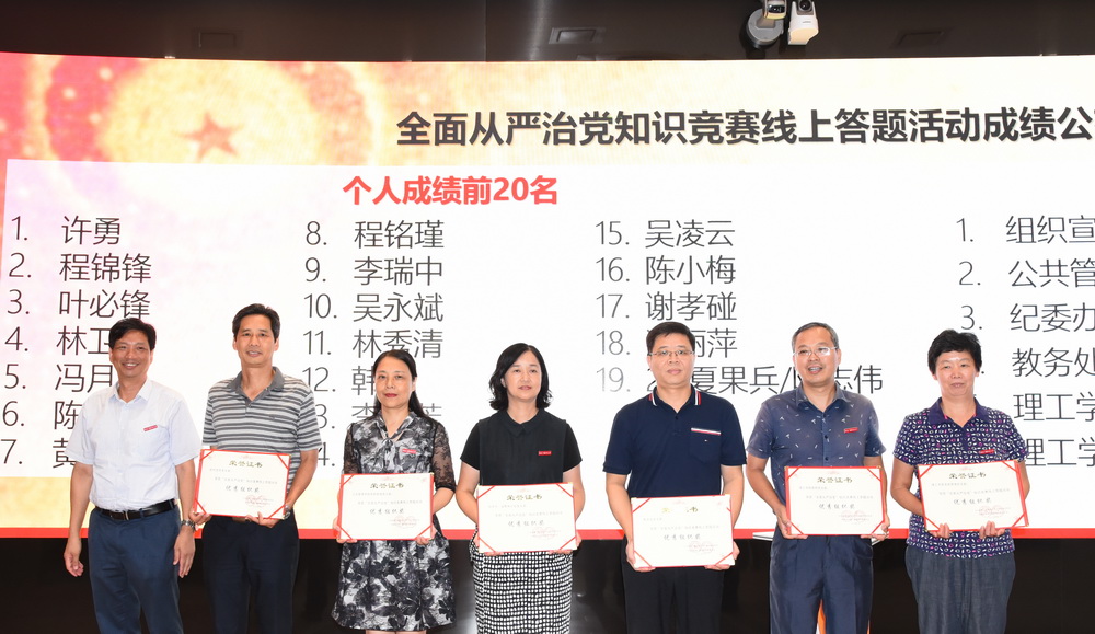 经过紧张的角逐,理工学院党总支参赛队获得竞赛一等奖;职业学院党总支、人事处及直属党支部参赛队获得二等奖;机关党总支、公共管理学院党总支、文经学院党总支参赛队获得三等奖。竞赛还对全面从严治党线上答题活动排名前6名的党支部以及排名前20名的个人给予了表彰。