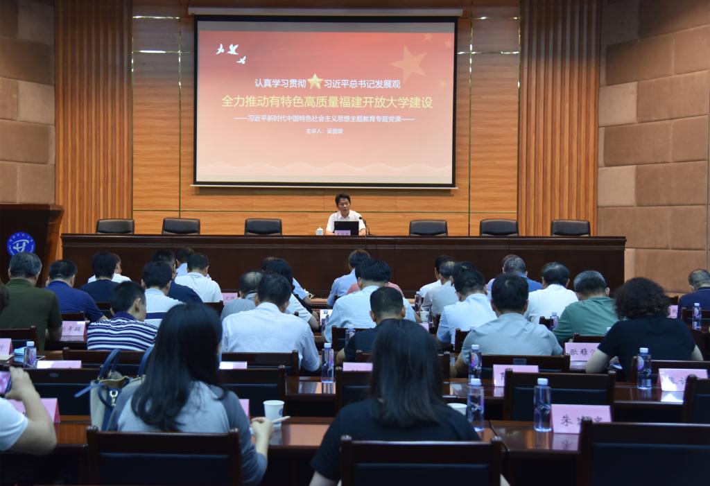 按照中央和省委学习贯彻习近平新时代中国特色社会主义思想主题教育部署要求,6月16日下午,党委副书记、校长吴国荣在桂山校区博厚楼二楼会议厅以《认真学习贯彻习近平总书记发展观 全力推动有特色高质量福建开放大学建设》为题讲授专题党课。省委主题教育第13巡回指导组副组长林永忠莅会指导,校领导马成斌、沈光辉、王幼新、吴建铭、李正光参加会议。