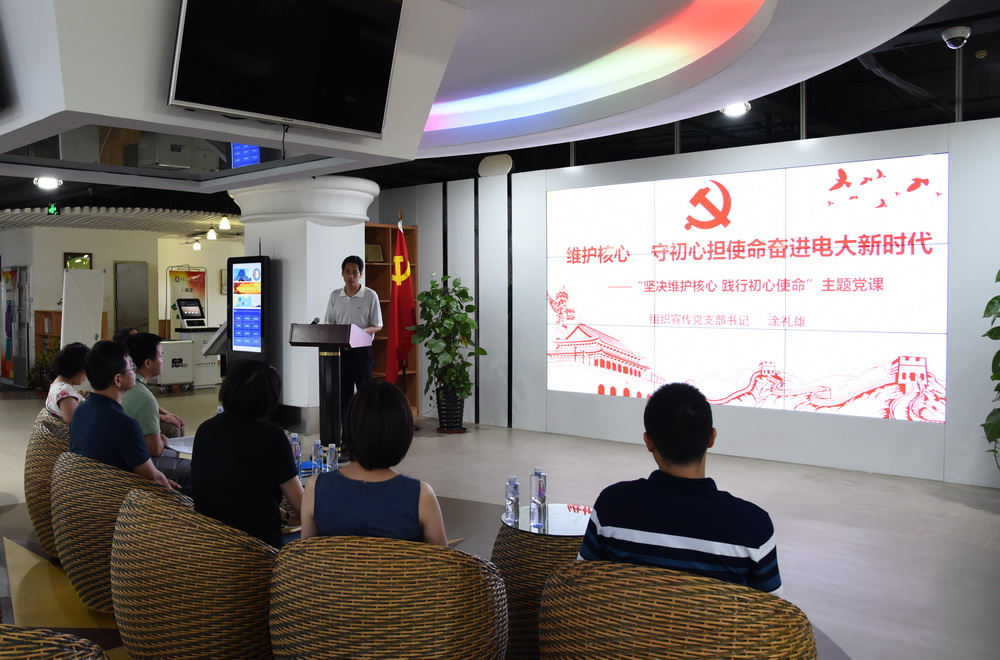 为深入学习贯彻习近平新时代中国特色社会主义思想和党的十九大精神,树牢“四个意识”,坚定“四个自信”,坚决做到“两个维护”,7月4日下午,组织宣传党支部全体党员佩戴党员徽章在桂山校区三楼数字学习中心开展“坚决维护核心、践行初心使命”主题党日活动。